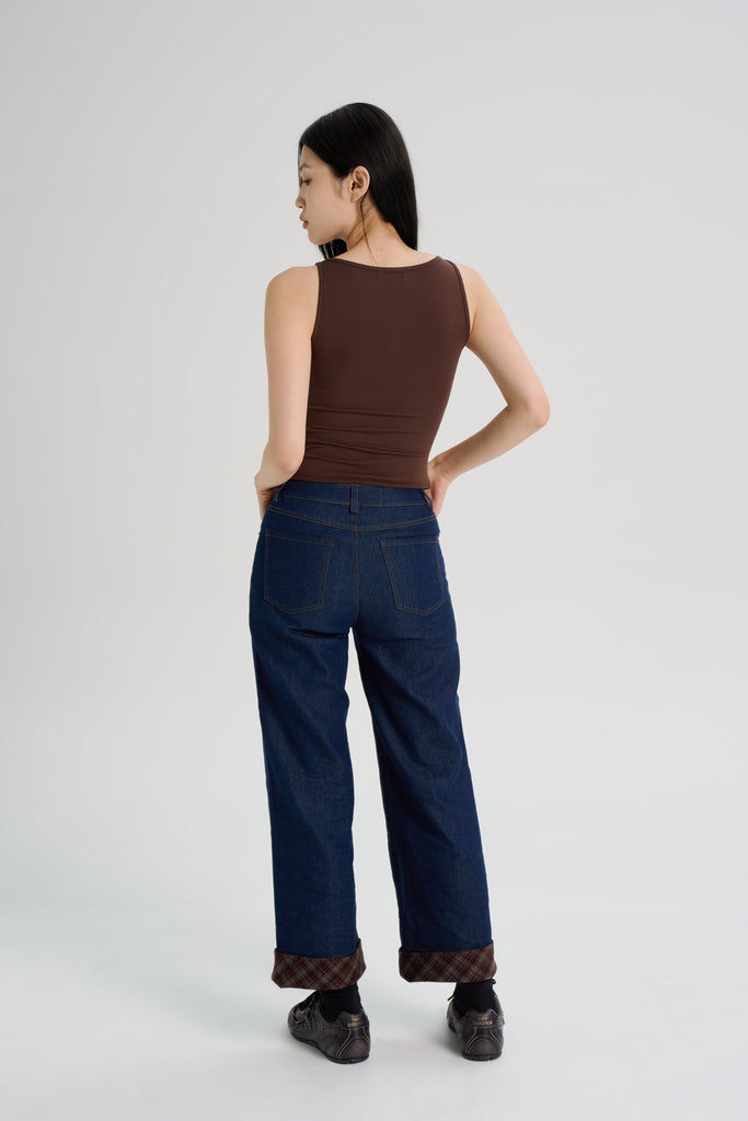 Indigo Wash Turn Up Plaid Detail Jeans