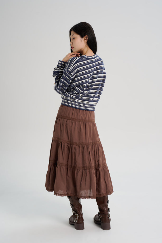 A full maxi skirt for maximum sweetness and whimsy. Lace trim detail on each tier. Elasticated waist band. Fully lined.